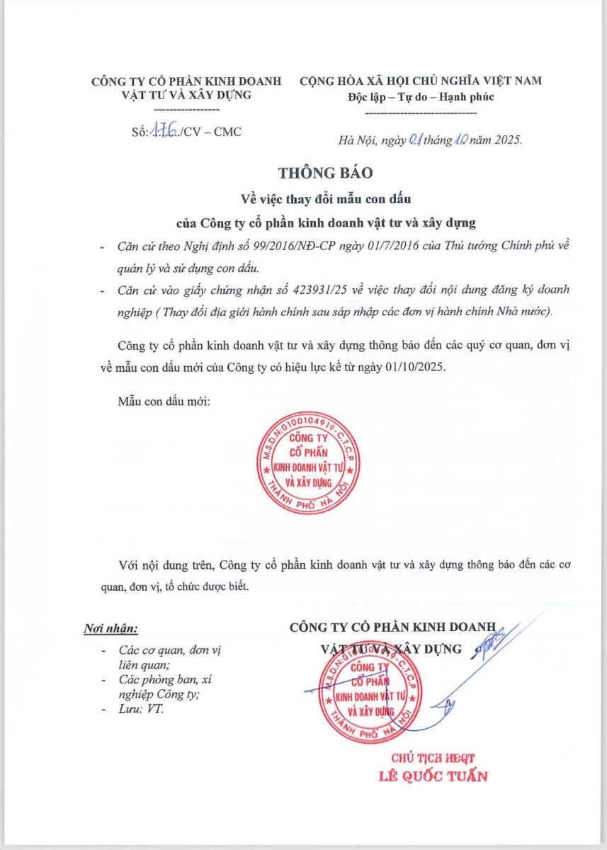 THÔNG BÁO VỀ VIỆC THAY ĐỔI MẪU DẤU MỚI CÔNG TY